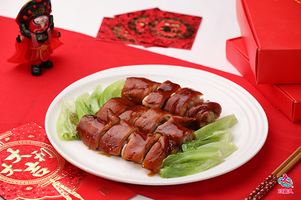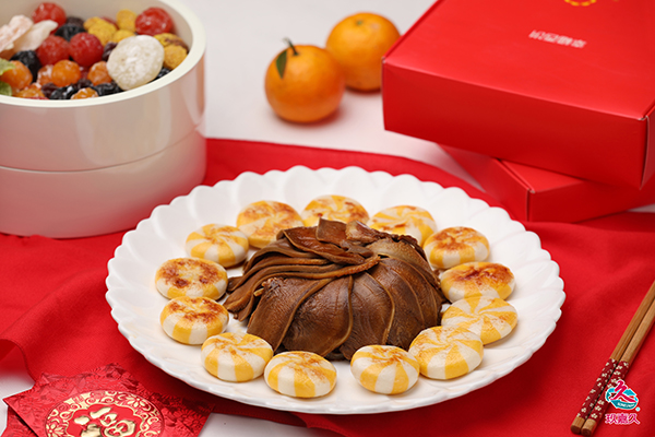 大吉大利:豬舌過沸水洗凈,放進秘制醬汁鹵制2小時,切薄片。再將煎好的榴蓮魚餅