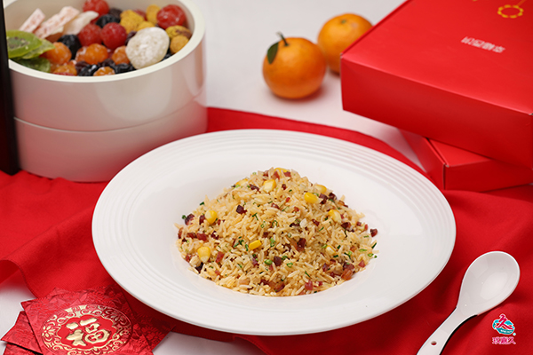金銀滿堂:米飯拌蛋黃液,炒出金黃色。再放進龍蝦球粒、玉米粒和臘味粒翻炒,最