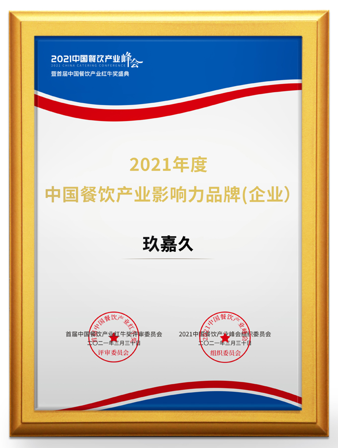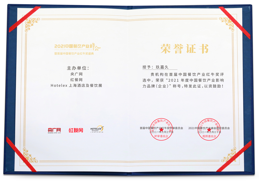 自2020年12月開始,在海選階段,“中國餐飲產(chǎn)業(yè)紅牛獎”的評審委員會從餐飲產(chǎn)業(yè)鏈和眾多提報的企業(yè)中,挑選了超過2500家符合評審規(guī)則的餐飲以及相關(guān)領(lǐng)域的企業(yè)。而后又歷經(jīng)了專家組的初審,以及具有一定爭議的復(fù)審。紅牛獎的評選歷時4個月之后,首屆“中國餐飲產(chǎn)業(yè)紅牛獎”的最終名單得到確認(rèn)。在此次頒獎盛典中,玖嘉久榮獲「2021年度中國餐飲產(chǎn)業(yè)影響力品牌(企業(yè))」。