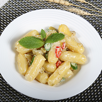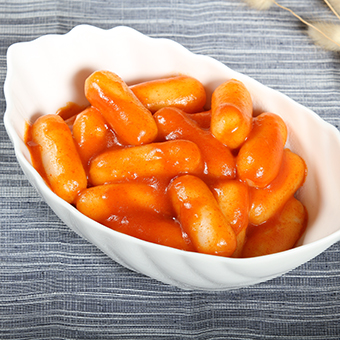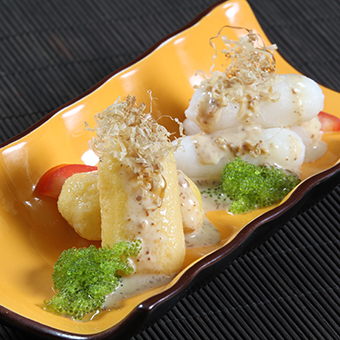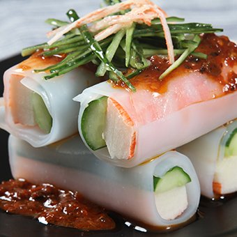 芝士腸切花,卷上刨好的海豬肉片,煎至微焦,撒上芝麻即可。