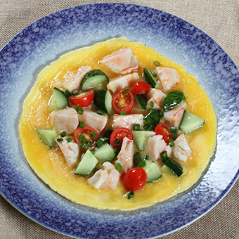 做法:龍蝦球提前解凍,青瓜、圣女果切好備用,雞蛋打散入鍋煎,趁蛋液未凝固倒入其他輔料煎熟即可。