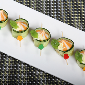 魚籽沙拉蝦用水焯熟,裹上切片的青瓜,擠上沙拉醬即可。